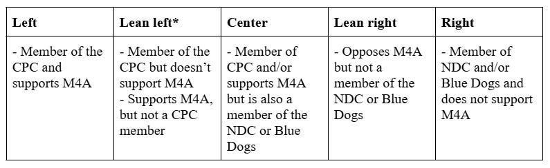 I divided Democrats into five groups based on caucus membership and whether they support Medicare for All. The following table describes each group. The use of the “left” and “right” labels here, of course, are meaningful only in the sense of describing where Democratic congressmembers fall relative to each other.